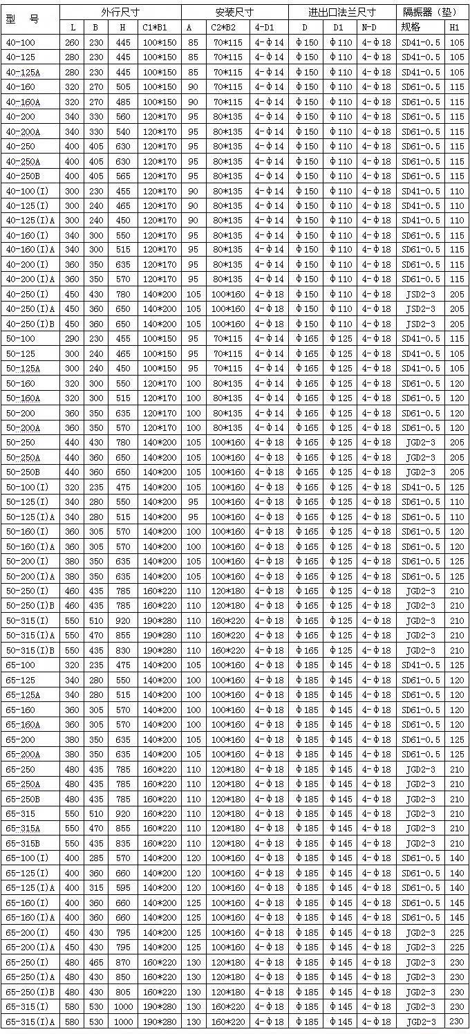 ISG、IRG、GRG、YG、IHG、IHGB型立式管道离心泵性能参数